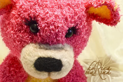А так все по прежнему - белая фактурная пряжа, синтепон, стеклогранулят, 5 шплинтов, стеклянные глазки, реснички, шерсть, кид мохер, полубусины и бисейр, пуговка.Мишутка тонирована.