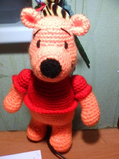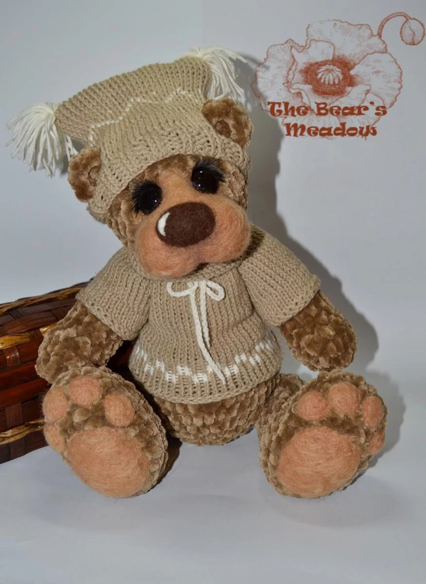 Медвежонок Ромка связан крючком из фактурной пряжи, всего 8 см ростиком (без шапочки). Внутри у него синтепон и стеклянный гранулят, 10 шплинтов - головка и лапки на качающихся креплениях.Мордашка привалена шерстью, глазки стекло+реснички.