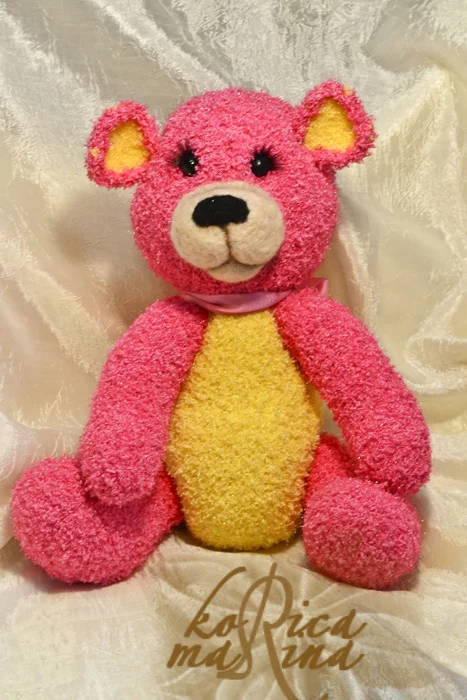 Оделся мишутка в теплый и яркий комплект из колпачка и шарфика. Шапочка украшена ярким клубничным бубенчиком. Ромка едет покорять северную столицу, на выставку Тедди Мир, Думаю он добавит немного красок в питерскую суету, а возможно и найдет там новую семью...
