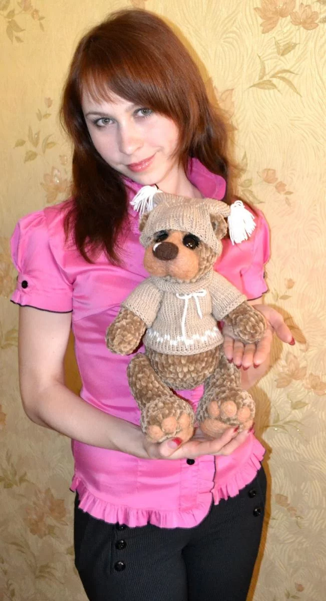 Делала на заказ еще одну Радость.Конечно же , немного нового в образе - кофточка с ажурным воротничком, по просьбе заказчицы ажурный ободочек, немного не такой как хотелось, просто тот, что планировался категорически не подошел мишутке.