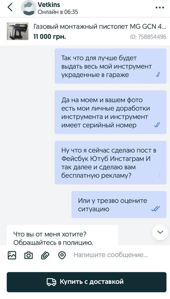 Я хочу Вас познакомить с Виолетта Давиденко, которая продаёт ворованные вещи на OLX Україна , среди них мой инструмент , украденный с моего гаража.