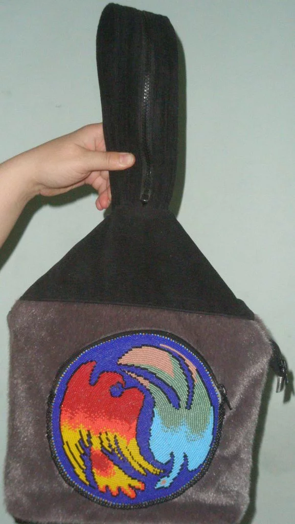 особо не заморачиваюсь на чем вышивать, джинс, замша, кожа, кожзам, вобщем все что достаточно плотное и держит форму. Бисер люблю чешский №10 или №11, но годится и китай, а по размерам - первая вышивка в диаметре 19 см, примерно такого же размера и панда, немного поменьше вышивка с Че, где-то 15 х 10 см. "Побочный продукт" - это сумки, в дизайне которых использована вышивка