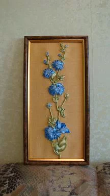 Картина "Цикорий". Вышивка выполнена атласными лентами, размер работы 14Х30 см, бисер - Япония.