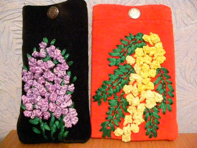 Чехлы для мобильных телефонов ("Ирисы" и "Желтые розы"). Размер 8,5 Х14 см, выполнены из джинсовой ткани, вышивка - атласные ленты, внутри подкладочная ткань.