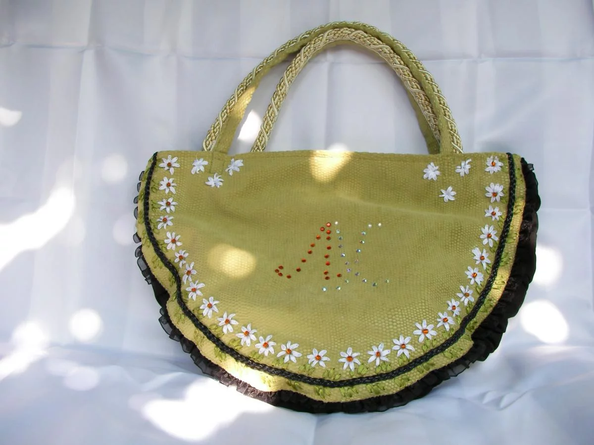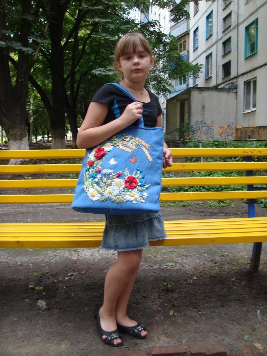 Сумка "Лето" (размер 38Х42 см) , выполнена из джинсовой ткани с уплотнителем, застегивается на "молнию", внутри - подкладка с двумя карманами. Вышивка выполнена вручную атласными лентами.