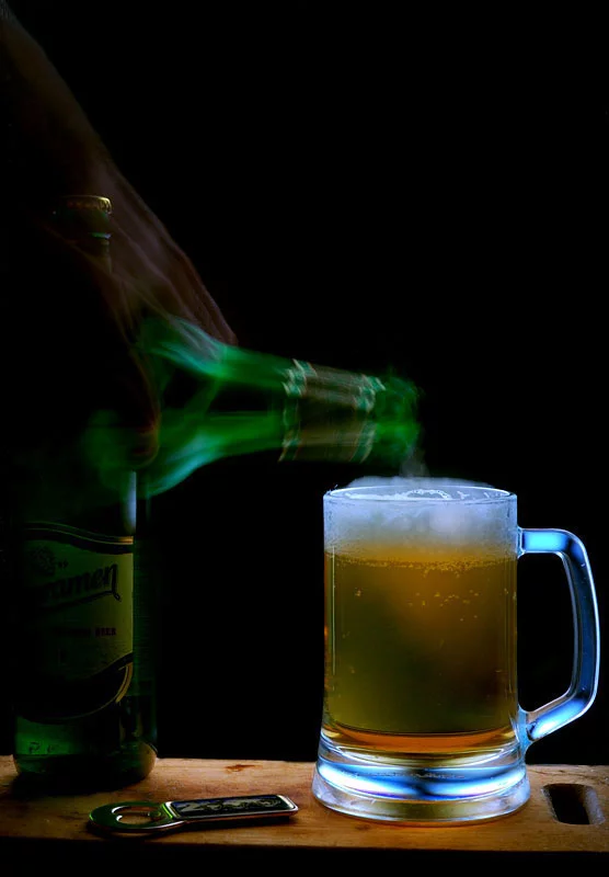 я бы в кадр уже ничего не добавлял ....... ИМХО я бы лучше попробывал бутылку резче сделать и струю добавил ........ опять же ИМХО :)