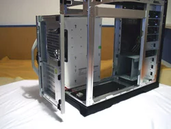 При всем этом ширина корпуса 24 см, а с "конструкцией" наверху - 25см. Высота 54 см, а длина - 64 см. Шасси - алюминий толщиной около 2,5 мм (т.к. больше 2 , но меньше 3 мм - мерял линейкой). Стенки сделаны из 2 мм алюминия, а передняя дверца - из 3 мм алюминия. Весит вся конструкция, субьективно, около 15 кг (реально наверно меньше, хз). Комплектация - два кулера 120мм - один сзади, другой на корзине для дисков (кстати, единственная часть, выполненная из стали). Ну и парочка коробочек с различными мелочами