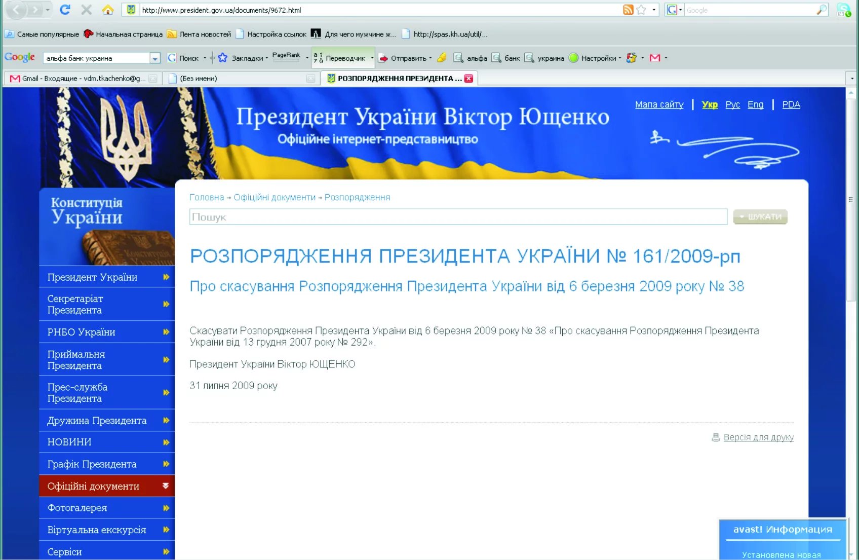 РОЗПОРЯДЖЕННЯ ПРЕЗИДЕНТА УКРАЇНИ № 161/2009-рп