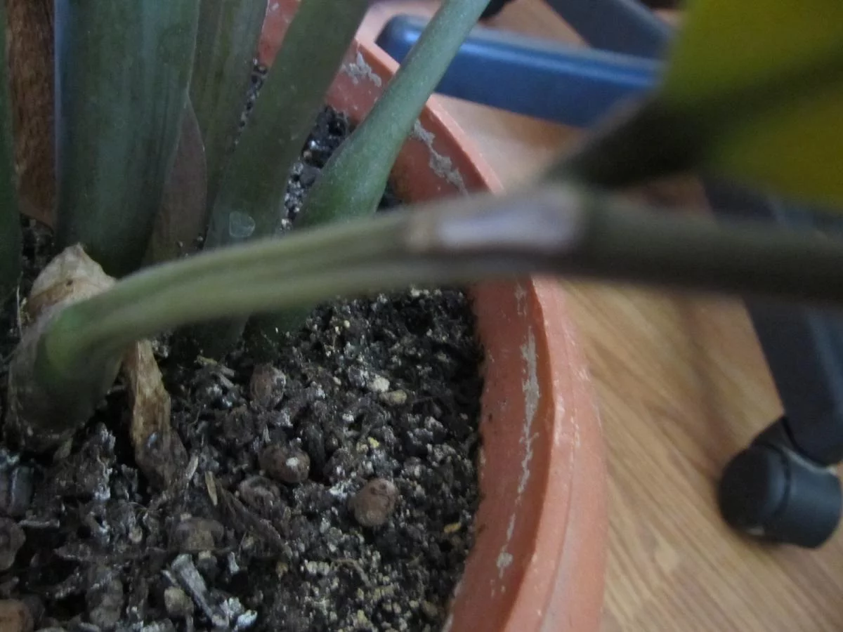 Странно, что при норм. корнях такое с картошкой... Похоже, что была пересушка, а потом залив, т.к. пустые только края корней, да и пустые, а не гниль.... Если там никто не живёт, то Вы растение пересушили )))))) При поливе нужно следить, чтобы вода промачивала весь ком земли, при посадке, для этого, нужно хорошо уплотнять грунт. Поливать редко, но обильно смочив ком земли, до выхода излишков воды в поддон, откуда остатки слить через час(как правило, через час там ничего уже нет )