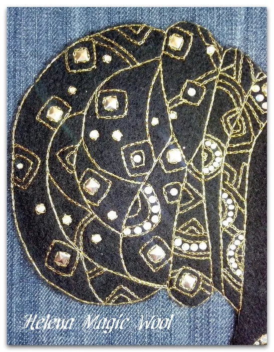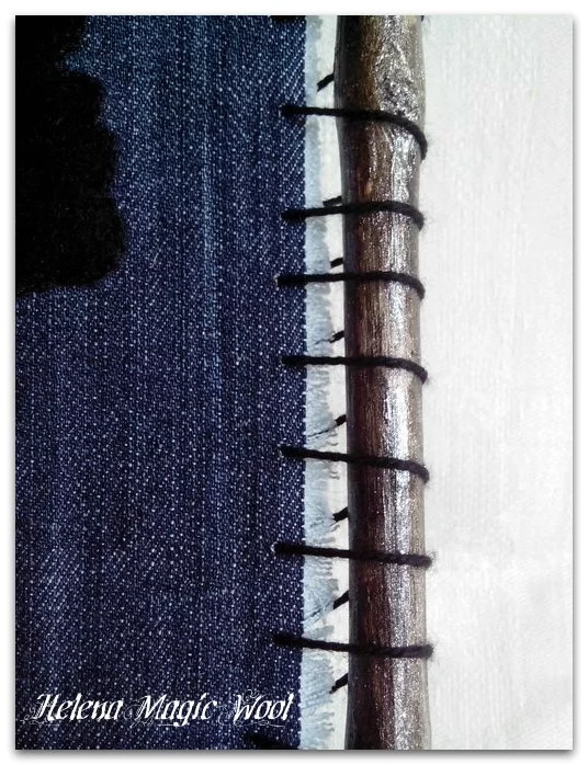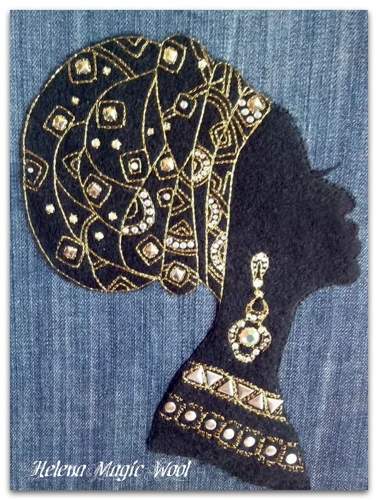Картина сваляна сухим способом на джинсовой ткани, инкрустирована стразами "хамелеон", прошита "золотой" нитью. Рама - натуральное дерево, тонированное двумя видами лака.